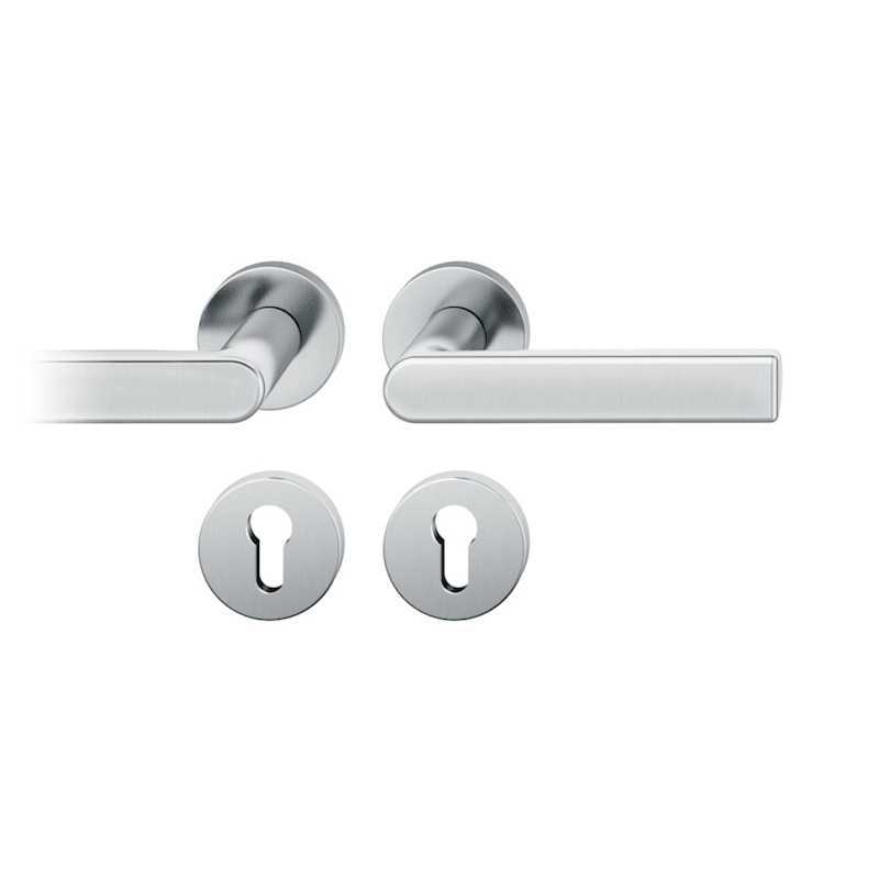 FSB Drückergarnitur 12 1244; Produkttyp: Drückergarnitur; Produkttyp (Hersteller): Drückergarnitur; Ausführung: Rosette; Befestigungsart Drückerrosette (außen): verdeckt verschraubt; Befestigungsart Drückerrosette (innen): verdeckt verschraubt; Befestigungsart Schlüsselrosette (außen): verdeckt verschraubt; Befestigungsart Schlüsselrosette (innen): verdeckt verschraubt; Befestigungstechnik: mit Stütznocken; Montageart: aufliegend; Form Drückerrosette: rund; Form Schlüsselrosette (außen): rund; Form Schlüsselrosette (innen): rund; Vierkant: 8 mm; Material: Edelstahl; Material Unterkonstruktion (Griffrosette): Kunststoff-Edelstahlverbundbau; Form Türgriff (innen): Design; Form Türgriff (außen): Design; Durchmesser Schlüsselrosette: 55 mm; Länge Türgriff (innen): 140 mm; Länge Türgriff (außen): 140 mm; Höhe Türgriff (innen): 58 mm; Höhe Türgriff (außen): 58 mm; Durchmesser Drückerrosette (außen): 55 mm; Durchmesser Drückerrosette (innen): 55 mm; Höhe Drückerrosette (außen): 7 mm; Höhe Drückerrosette (innen): 7 mm; Höhe Schlüsselrosette (außen): 7 mm; Höhe Schlüsselrosette (innen): 7 mm; Lagerung: mit Rückholfeder,Adapter-Standardlager,festdrehbar; Einsatzbereich: Objekttür; Türart: Vollblatt; Türwerkstoff: Holz,Stahl; Lochung: Profilzylinder gelocht; DIN-Richtung: DIN Links-Rechts; Farbe: grau; Farbton: edelstahl; Oberfläche: poliert; Ausführung Vierkant: Stabilstift; Betätigungswinkel max.: 45 °; Design Türdrücker: gmp Architekten von Gerkan, Marg und Partner; Türstärke min.: 39 mm; Türstärke max.: 58 mm; Norm: DIN EN 1906; EN 1906 - Gebrauchskategorie: Klasse 4; EN 1906 - Dauerhaftigkeit: Klasse 7; EN 1906 - Türmasse: -; EN 1906 - Feuerbeständigkeit: Klasse 0; EN 1906 - Sicherheit: Klasse 1; EN 1906 - Korrosionsbeständigkeit: Klasse 5; EN 1906 - Einbruchschutz: Klasse 0; EN 1906 - Ausführungsart: Typ A; Klassifizierungsschlüssel EN 1906: 47-0150A