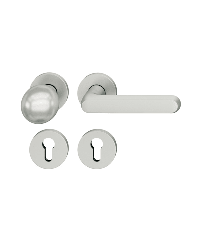FSB Wechselgarnitur 12 1246; Produkttyp: Wechselgarnitur; Produkttyp (Hersteller): Wechselgarnitur; Ausführung: Rosette; Befestigungsart Drückerrosette (außen): verdeckt verschraubt; Befestigungsart Drückerrosette (innen): verdeckt verschraubt; Befestigungsart Schlüsselrosette (außen): verdeckt verschraubt; Befestigungsart Schlüsselrosette (innen): verdeckt verschraubt; Befestigungstechnik: mit Stütznocken; Montageart: aufliegend; Form Drückerrosette: rund; Form Schlüsselrosette (außen): rund; Form Schlüsselrosette (innen): rund; Vierkant: 8 mm; Material: Aluminium; Material Unterkonstruktion (Griffrosette): Kunststoff-Edelstahlverbundbau; Form Türgriff (innen): L-Form; Form Türgriff (außen): Kugelknopf; Ausführung Türgriff (außen): fest; Gewinde Knopf/Griffplatte: M12; Durchmesser Türgriff (außen): 50 mm; Breite Türgriff (innen): 24 mm; Durchmesser Schlüsselrosette: 55 mm; Länge Türgriff (innen): 135 mm; Höhe Türgriff (innen): 54 mm; Höhe Türgriff (außen): 70 mm; Durchmesser Drückerrosette (außen): 55 mm; Durchmesser Drückerrosette (innen): 55 mm; Höhe Drückerrosette (außen): 7 mm; Höhe Drückerrosette (innen): 7 mm; Höhe Schlüsselrosette (außen): 7 mm; Höhe Schlüsselrosette (innen): 7 mm; Lagerung: Adapter-Standardlager,festdrehbar; Einsatzbereich: Objekttür,Haustür; Türart: Vollblatt; Türwerkstoff: Holz,Stahl; Lochung: Profilzylinder gelocht; DIN-Richtung: DIN Links-Rechts; Farbe: silber; Farbton: naturfarben; Oberfläche: eloxiert; Material Unterkonstruktion (Schlüsselrosette): Kunststoff-Edelstahlverbundbau; Ausführung Vierkant: Rollenwechselstift; Betätigungswinkel max.: 45 °; Design Türdrücker: Graft; Türstärke min.: 39 mm; Türstärke max.: 58 mm; Norm: DIN EN 1906