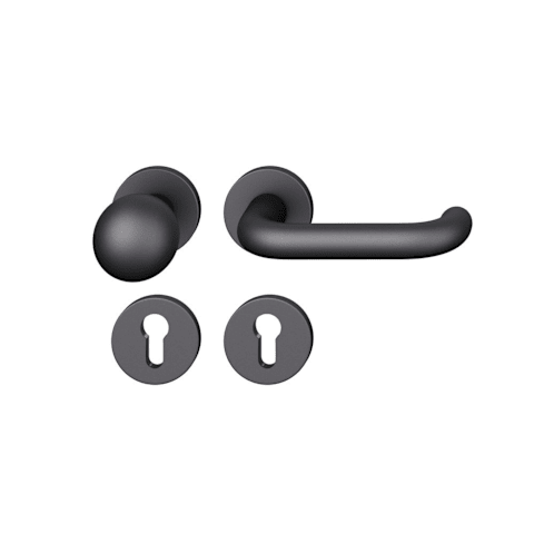 FSB Wechselgarnitur 12 1146; Produkttyp: Wechselgarnitur; Produkttyp (Hersteller): Wechselgarnitur; Ausführung: Rosette; Befestigungsart Drückerrosette (außen): verdeckt verschraubt; Befestigungsart Drückerrosette (innen): verdeckt verschraubt; Befestigungsart Schlüsselrosette (außen): verdeckt verschraubt; Befestigungsart Schlüsselrosette (innen): verdeckt verschraubt; Befestigungstechnik: mit Stütznocken; Montageart: aufliegend; Form Drückerrosette: rund; Form Schlüsselrosette (außen): rund; Form Schlüsselrosette (innen): rund; Vierkant: 8 mm; Material: Aluminium; Material Unterkonstruktion (Griffrosette): Kunststoff-Edelstahlverbundbau; Form Türgriff (innen): U-Form; Form Türgriff (außen): Kugelknopf; Ausführung Türgriff (außen): fest; Gewinde Knopf/Griffplatte: M12; Durchmesser Türgriff (innen): 20 mm; Durchmesser Türgriff (außen): 50 mm; Durchmesser Schlüsselrosette: 55 mm; Länge Türgriff (innen): 142 mm; Höhe Türgriff (innen): 63 mm; Höhe Türgriff (außen): 70 mm; Durchmesser Drückerrosette (außen): 55 mm; Durchmesser Drückerrosette (innen): 55 mm; Höhe Drückerrosette (außen): 7 mm; Höhe Drückerrosette (innen): 7 mm; Höhe Schlüsselrosette (außen): 7 mm; Höhe Schlüsselrosette (innen): 7 mm; Lagerung: Adapter-Standardlager,festdrehbar; Einsatzbereich: Haustür,Objekttür; Türart: Vollblatt; Türwerkstoff: Holz,Stahl; Lochung: Profilzylinder gelocht; DIN-Richtung: DIN Links-Rechts; Farbe: schwarz; Oberfläche: gestrahlt,eloxiert; Material Unterkonstruktion (Schlüsselrosette): Kunststoff-Edelstahlverbundbau; Ausführung Vierkant: Rollenwechselstift; Betätigungswinkel max.: 45 °; Türstärke min.: 39 mm; Türstärke max.: 58 mm; Norm: DIN EN 1906
