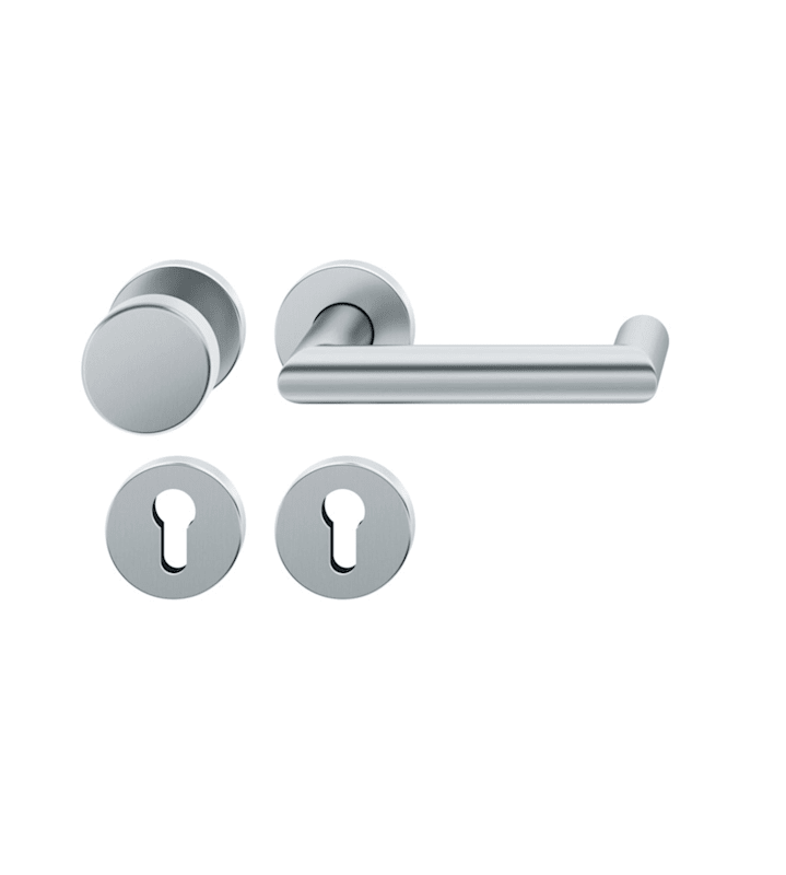 FSB Wechselgarnitur 12 1016; Produkttyp: Wechselgarnitur; Produkttyp (Hersteller): Wechselgarnitur; Ausführung: Rosette; Befestigungsart Drückerrosette (außen): verdeckt verschraubt; Befestigungsart Drückerrosette (innen): verdeckt verschraubt; Befestigungsart Schlüsselrosette (außen): verdeckt verschraubt; Befestigungsart Schlüsselrosette (innen): verdeckt verschraubt; Befestigungstechnik: mit Stütznocken; Montageart: aufliegend; Form Drückerrosette: rund; Form Schlüsselrosette (außen): rund; Form Schlüsselrosette (innen): rund; Vierkant: 8 mm; Material: Edelstahl; Material Unterkonstruktion (Griffrosette): Kunststoff-Edelstahlverbundbau; Form Türgriff (innen): U-Form,Gehrung; Form Türgriff (außen): Flachknopf; Ausführung Türgriff (außen): fest; Gewinde Knopf/Griffplatte: M12; Durchmesser Türgriff (innen): 21 mm; Durchmesser Türgriff (außen): 55 mm; Durchmesser Schlüsselrosette: 55 mm; Länge Türgriff (innen): 143 mm; Höhe Türgriff (innen): 58 mm; Höhe Türgriff (außen): 45 mm; Durchmesser Drückerrosette (außen): 55 mm; Durchmesser Drückerrosette (innen): 55 mm; Höhe Drückerrosette (außen): 7 mm; Höhe Drückerrosette (innen): 7 mm; Höhe Schlüsselrosette (außen): 7 mm; Höhe Schlüsselrosette (innen): 7 mm; Lagerung: Adapter-Standardlager,festdrehbar; Einsatzbereich: Haustür,Objekttür; Türart: Vollblatt; Türwerkstoff: Holz,Stahl; Lochung: Profilzylinder gelocht; DIN-Richtung: DIN Links-Rechts; Farbe: grau; Farbton: edelstahl; Oberfläche: fein matt; Material Unterkonstruktion (Schlüsselrosette): Kunststoff-Edelstahlverbundbau; Ausführung Vierkant: Rollenwechselstift; Betätigungswinkel max.: 45 °; Türstärke min.: 39 mm; Türstärke max.: 58 mm; Norm: DIN EN 1906