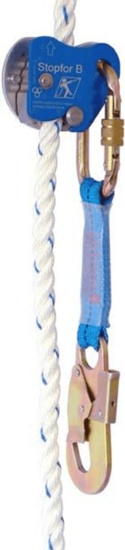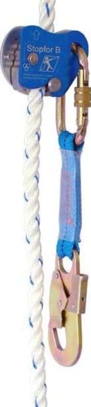 Auffanggerät stopfor™ B • Horizontale und vertikale Zulassung nach EN 353-2 • Gedrehtes Seil: 14 mm • Mitlaufend • Vom Seil abnehmbar • Integrierte Falldämpfung: durch Kippen des Geräts • Gehäuse: Aluminium