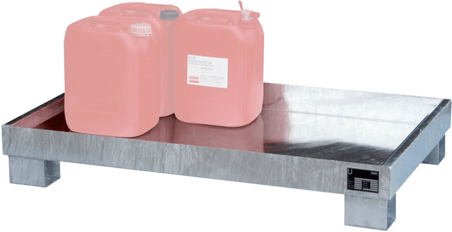 Auffangwannen, Stahlblech • Material: Stahlblech, 3 mm, verzinkt • Geprüft und sicher: zugelassen zur Lagerung entzündbarer Flüssigkeiten der GHS-Kategorie 1–3 und gewässergefährdender Flüssigkeiten
