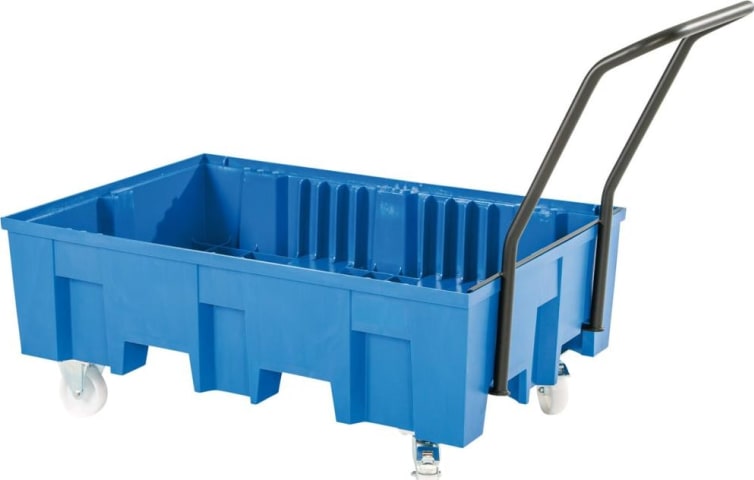 Auffangwanne, Kunststoff (PE), fahrbar • Material: Kunststoff (Polyethylen) • Mit Polyamidrollen • Mit Schiebebügel (Maße ohne Schiebebügel) • Hohe Beständigkeit gegen Säuren, Laugen, Öle und andere aggressive Gefahrstoffe • Leichte Handhabung durch geringes Eigengewicht • Traglast stationär: 150 kg, mobil: 120 kg • Geeignet für den leichten und sicheren innerbetrieblichen Transport Hinweis: Zur vorschriftsmäßigen Lagerung gewässergefährdender Flüssigkeiten aller Gefährdungsklassen zugelassen. Sie sind hochbeständig gegen Öle, Säuren, Laugen und andere aggressive Stoffe. Zur Lagerung entzündbarer Flüssigkeiten sind sie nicht zugelassen.