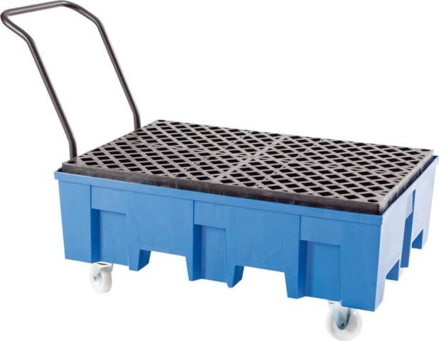 Auffangwanne, Kunststoff (PE), fahrbar • Material: Kunststoff (Polyethylen) • Mit Polyamidrollen • Mit Schiebebügel (Maße ohne Schiebebügel) • Hohe Beständigkeit gegen Säuren, Laugen, Öle und andere aggressive Gefahrstoffe • Leichte Handhabung durch geringes Eigengewicht • Traglast stationär: 150 kg, mobil: 120 kg • Geeignet für den leichten und sicheren innerbetrieblichen Transport Hinweis: Zur vorschriftsmäßigen Lagerung gewässergefährdender Flüssigkeiten aller Gefährdungsklassen zugelassen. Sie sind hochbeständig gegen Öle, Säuren, Laugen und andere aggressive Stoffe. Zur Lagerung entzündbarer Flüssigkeiten sind sie nicht zugelassen.
