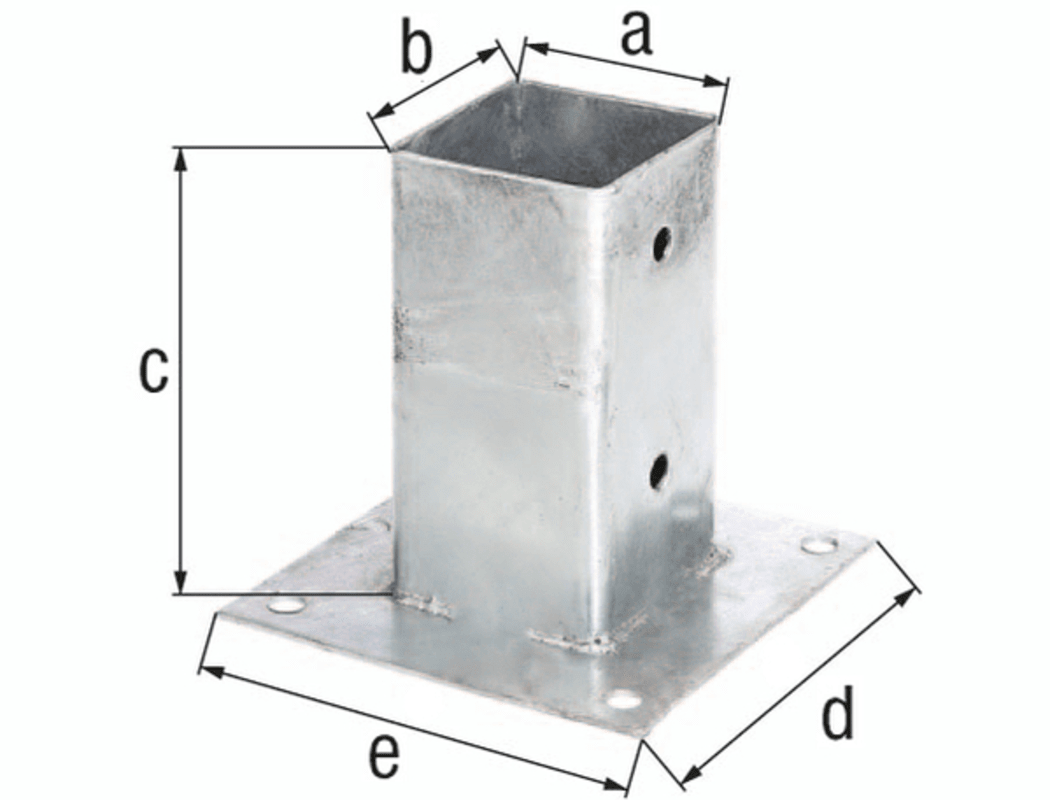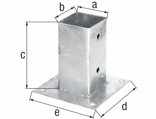 GAH Alberts Bodenhülse; Basis: Bodenhülse; Anwendungsbereich: für Vierkantpfosten; Befestigungsart: zum Aufschrauben; Material: Stahl; Oberfläche: feuerverzinkt; Material aufzulagerndes Bauteil: Holz; Befestigung: Schrauben; Höhe Pfostenaufnahme: 150 mm; Anzahl Lochungen: 8 St.; Durchmesser Lochung: 11 mm; Länge Grundplatte: 150 mm; Breite Grundplatte: 150 mm; Breite Pfosteneinlass: 91 mm; Länge Pfosteneinlass: 91 mm