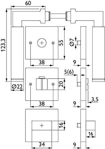 Bad-Drückergarnitur 1831 INFINITY - Klasse 3 | mit Rosetten 2211 K / Sichtscheibe rot/weiß | Ausf.: BAD mit Riegel 3220/3225 - 6 mm Vierkant | mit Hülse 7/8, Rückholfeder, Türstärke 37 - 44 mm | Oberfl. 74 (Classic Black, ähnl. RAL 9005)