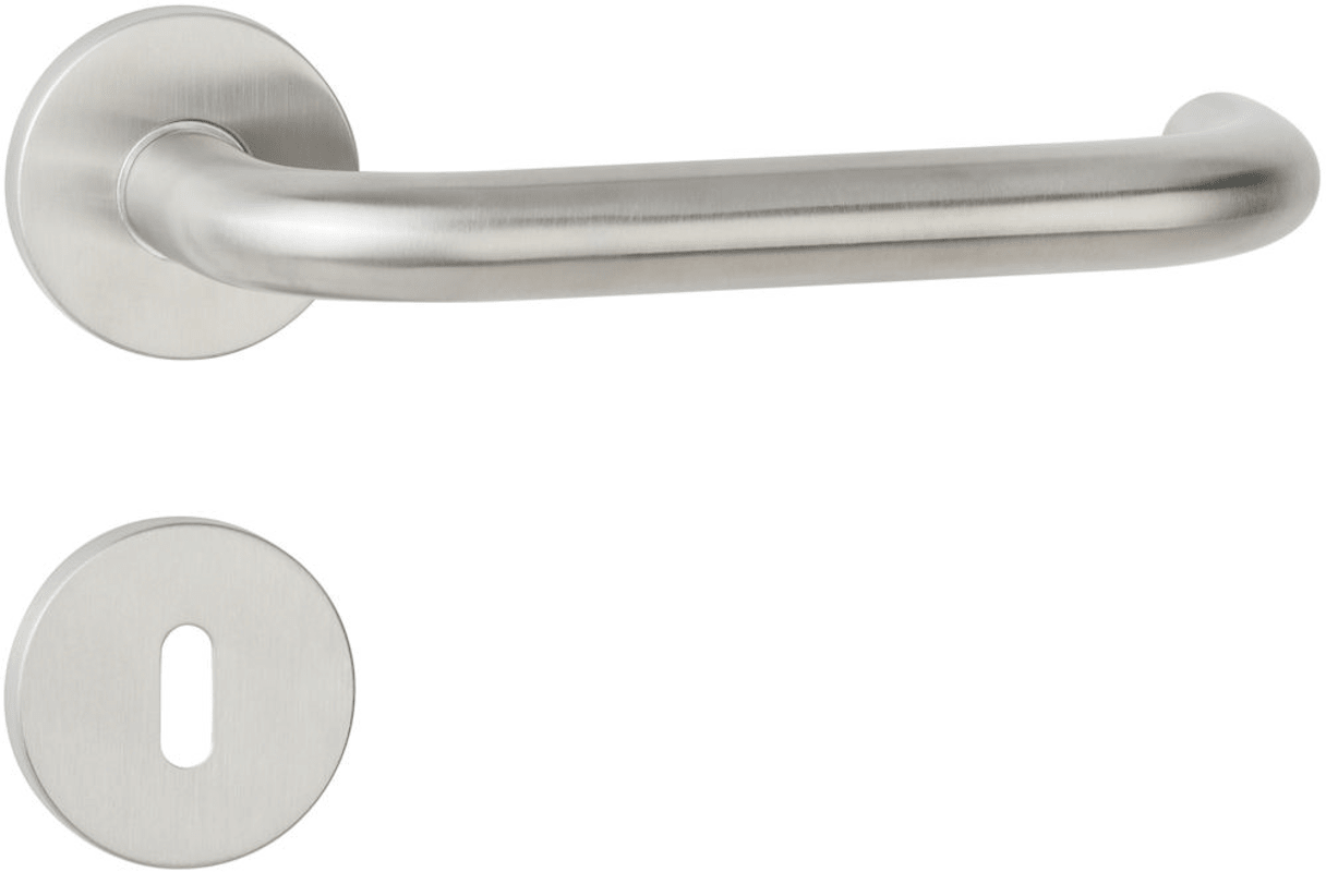 Bad-Drückergarnitur 1811 BASIC 11 - Klasse 4, mit Rosetten 2073 M, Ausf.: BAD rot/weiß mit großem Riegel 3221/3216, fest/drehb. m. Rückholf., Metall-UK, Tst. 37-48 mm, Oberfl. 60 (Edelstahl matt)