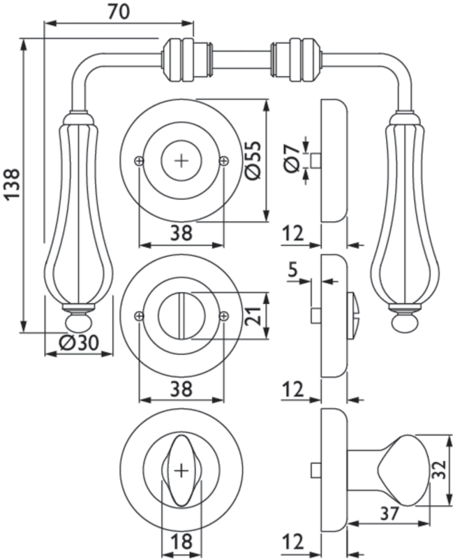 Bad-Drückergarnitur 1048 LADY, mit Schraubrosetten 2060, Ausf.: BAD mit Riegel 3215/3213, mit Rückholfeder, Oberfl. 06AP (Eisenf. Antik schwarz/Porz. weiß)