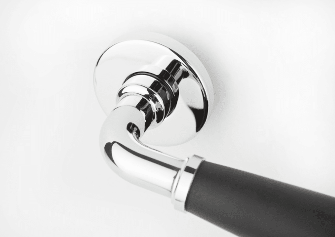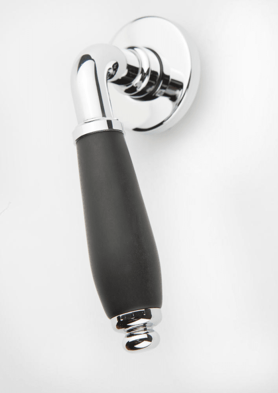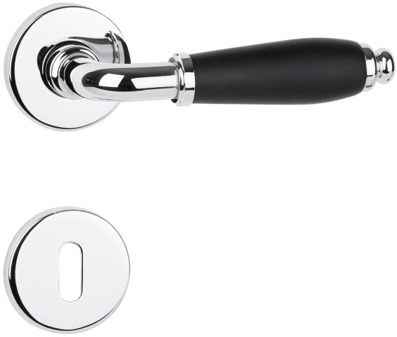Bad-Drückergarnitur 1157 LILLE, mit Rosetten 2074, Ausf.: BAD mit Riegel 3212/3216, mit Rückholfeder, Oberfl. 04 S (Glanzchrom/schwarz)