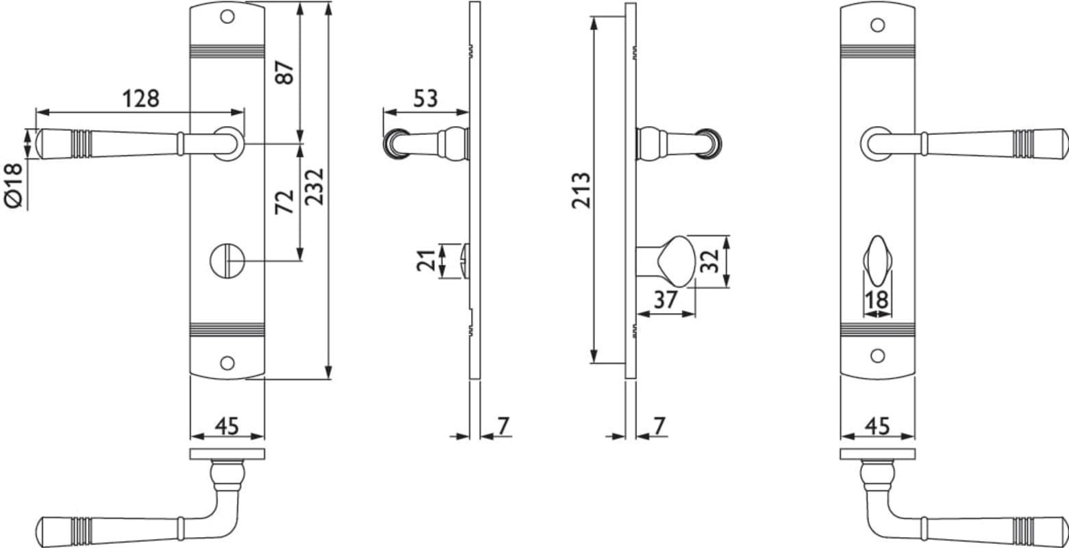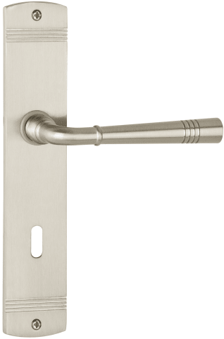 Bad-Drückergarnitur 1174 LYON, mit Langschild 2274, Ausf.: BAD 78 mm mit Riegel 3215/3213, Oberfl. 20 (Mattnickel)