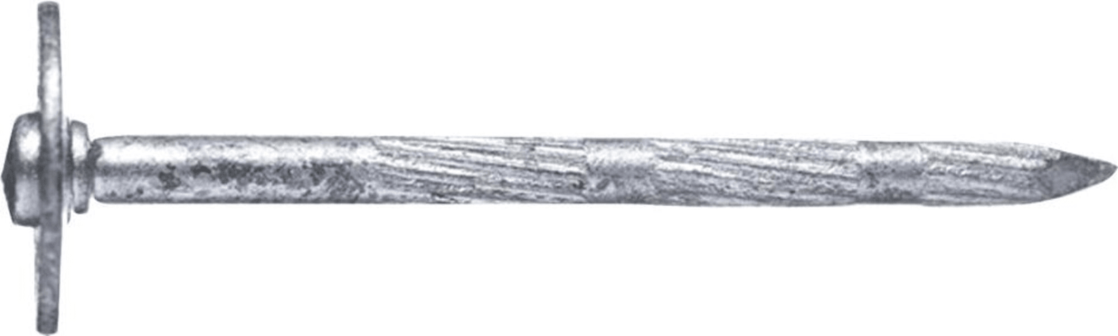 Stahlnagel, Scheibenkopf• Gehärtet, metallisiert • Mit unterbrochener Längsriffelung • Scheiben-Ø 15 mm