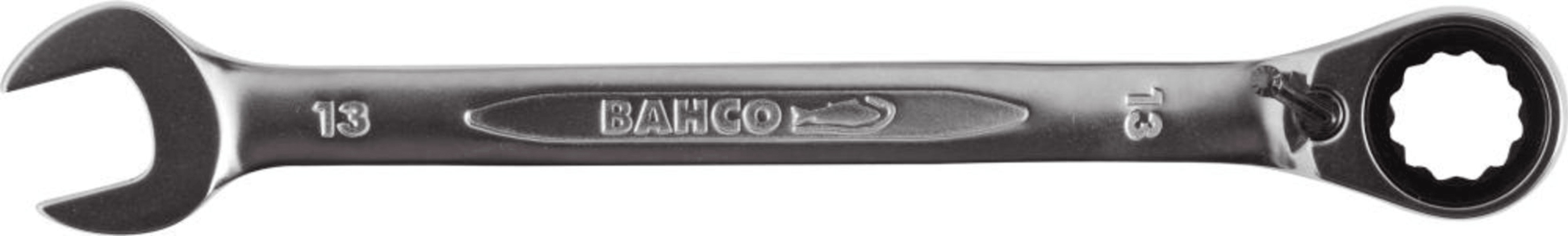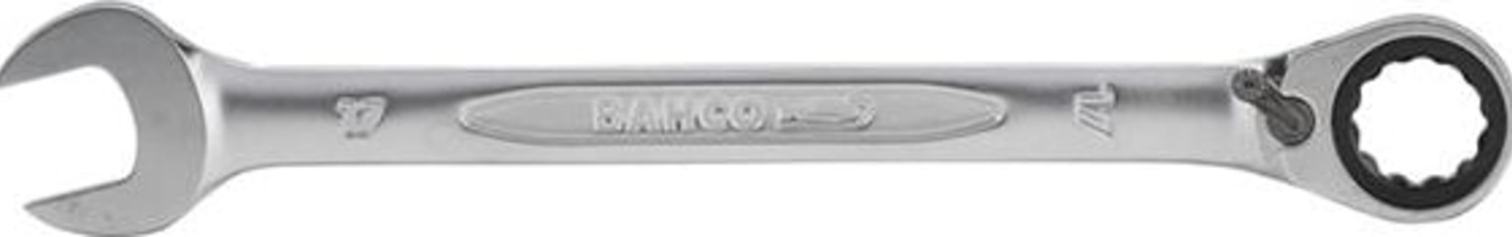 Ringratschenschlüssel, umschaltbar Nr. 1 RMISO 1711-1 und DIN 3113. Knarrenfunktion im Ringende für schnelleres Arbeiten, 5° Rückschwenkwinkel. Umschalthebel für schnelle Richtungsänderung. Maulstellung 15° mit dünnem Kopf, Dynamic-Drive-Profil. Hochleistungs-Stahllegierung, verchromte Micro-Matt-Ausführung.