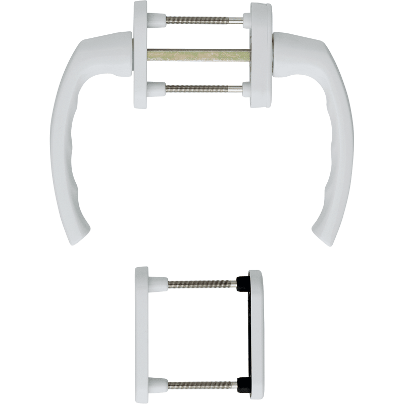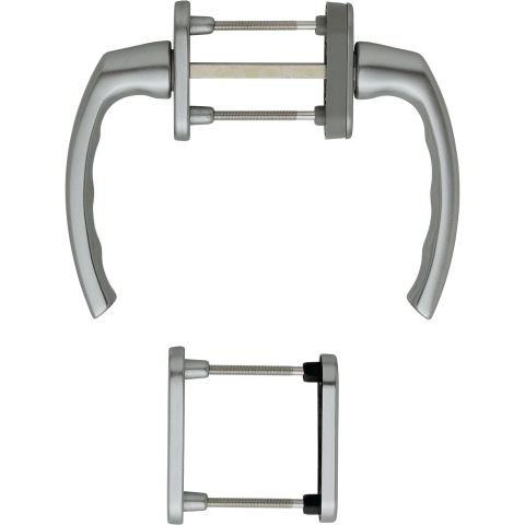 Aluminium-Dreh-/Kipp-Fenstergriff-Rosetten-Garnitur für Fenstertüren: Rastung: außen ohne, innen 90°. Rosetten: außen gegossen, innen Kunststoff-Unterkonstruktion mit Teil-Abdeckkappe, Stütznocken. B