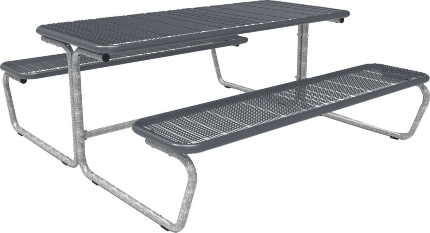 Bank-Tisch PALMA, Drahtgitter • Sitzteile und Tischplatte: aus stabilem, wartungsfreiem Drahtgitter, zusätzlich unterverzinkt und mit 350 µm hitze- und kälteisolierendem Polyamid-Rilsan thermobeschichtet • Mit Anti-Graffiti-Schutz • Drahtgitter: Rasteröffnung 11 mm, Drahtstärke 4 mm • Untergestell: aus langlebigem, feuerverzinktem Rundrohr, inkl. Bohrungen zur sicheren Verdübelung • Rundrohr: Ø 38 mm • Nutzbare Sitz-Tischbreite: 1770 mm • Tiefe: 1910 bis 2101 mm Lieferung: Zerlegt und unmontiert.