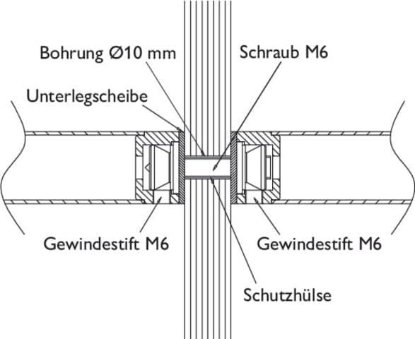 Befestigung für Stoßgriffe, mit 18 + 20 mm Ø geraden Stützen, zur paarweisen durchgehenden Befestigung, an Glastüren / Türstärke 8 - 12 mm