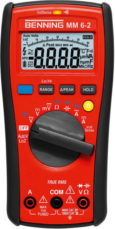 Digital-Multimeter MM 6-2• Gehäuse aus schlag- und bruchfestem Kunststoff • LC-Display mit Hintergrundbeleuchtung • Echt-Effektivwertmessung TRUE RMS • Kapazitäts- und Frequenzmessung, AC/DC-Strom