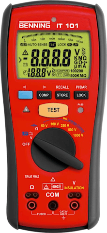 Isolations- und Widerstandsmessgerät IT 101Widerstandsmessgerät mit anwählbaren Grenzwerten für ISO-Messungen. Grüne LED für Prüfung bestanden, rote LED für Prüf-/Fremdspannung. Schaltbare Prüfspitze zum Auslösen des Messvorgangs. Interner Speicher, True RMS Spannungsmessung mit Tiefpassfilter. Automatische Entladung von kapazitiven Spannungen. Isolationswiderstand mit Berechnung des resultierenden Leckstromes, Polarisations-Index (PI) und dielektrischem Absorptionsgrad (DAR). Für Isolations- und Niederohmmessungen an elektrischen Anlagen, Geräten, Leitungen, Motoren und Generatoren.Lieferung: inklusive schaltbarer Prüfspitze, Messleitung, Krokodilklemmen, Gummischutzrahmen, Batterien und Tasche.