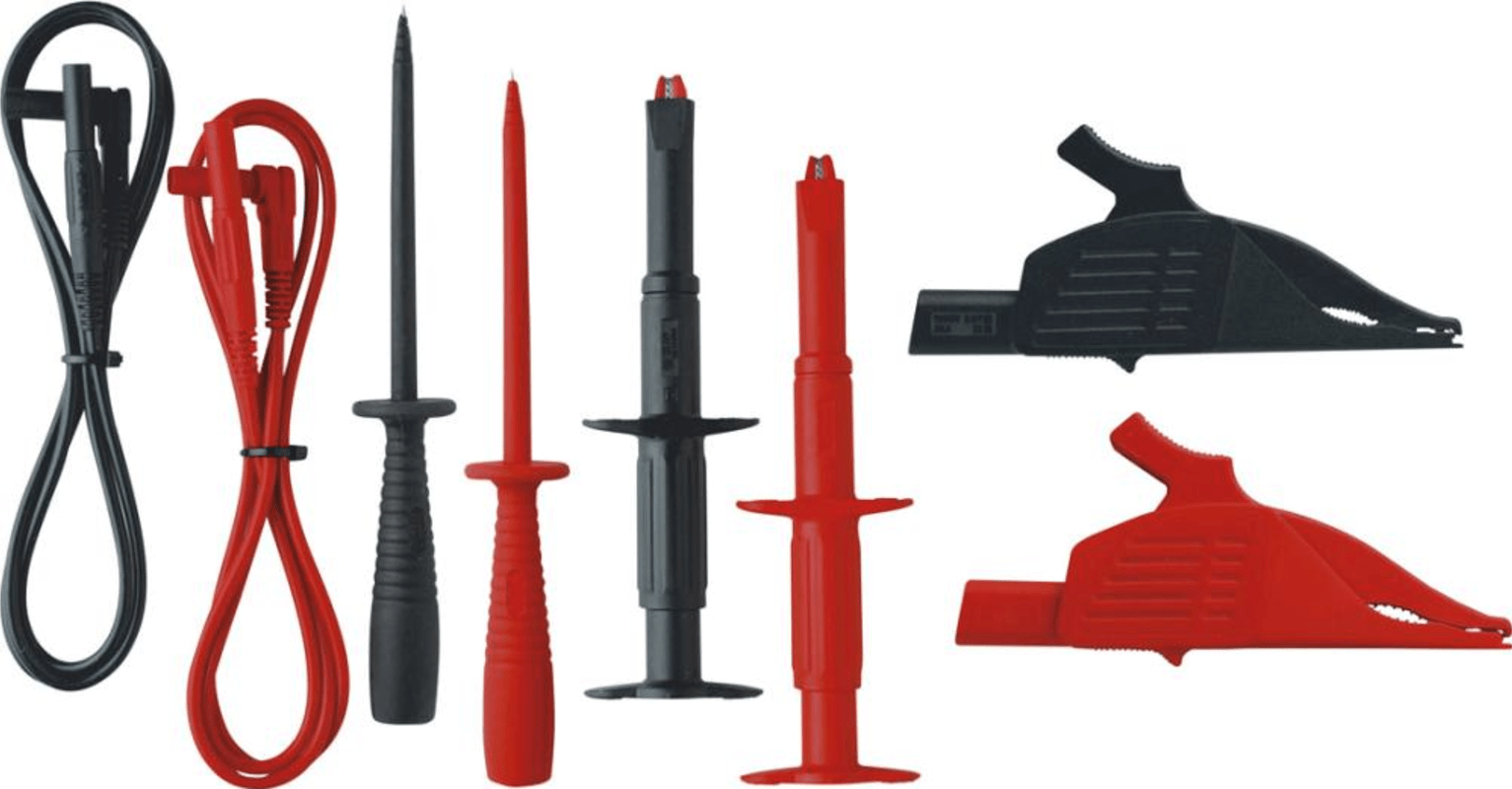 Inhalt: Sicherheitsmessleitungen (Silikon), Sicherheitsprüfspitzen (schlanke Messspitze), Sicherheits-Klauengreifer und Sicherheits-Krokodilklemmen.