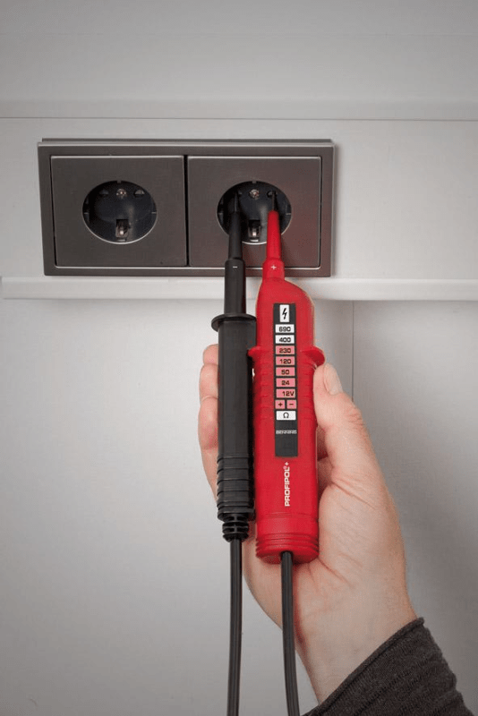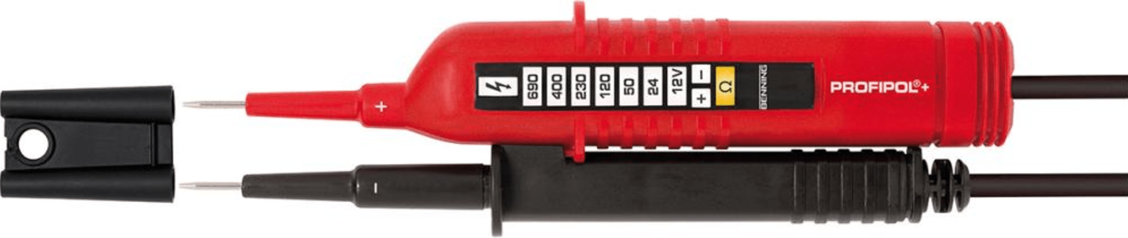 Spannungsprüfer PROFIPOL+• Schlanke und kompakte Bauform • Prüfgriffarretierung zur Einhandbedienung an Steckdosen und zur sicheren Aufbewahrung • Anzeigestufen von 12–690 V AC/DC voll funktionsfähi