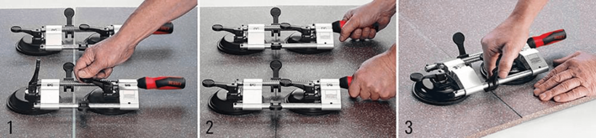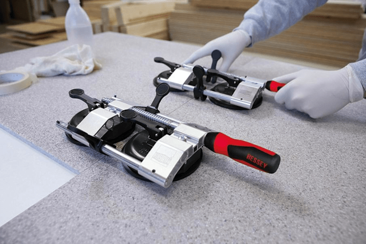 Plattenspanner PS55• Vakuumsauger zum Festsaugen der Platten • Exzenterhebel zum Ausgleich von Höhenunterschieden • Holzgriff zum Spannen in horizontaler Richtung • Zum Verspannen und Positionieren