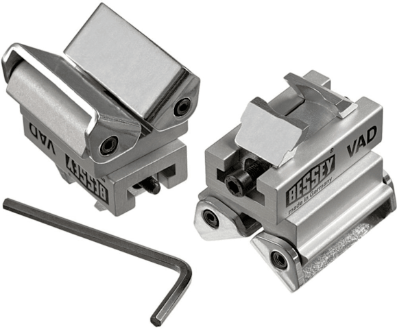 Vario-Spannaufsatz VAD• Stufenlose Winkelanpassung von 60° innen bis 60° außen • Geeignet für runde, ovale und winkelige Werkstücke • Passend für BESSEY Temperguss-TG und Ganzstahl-Schraubzwingen GZ