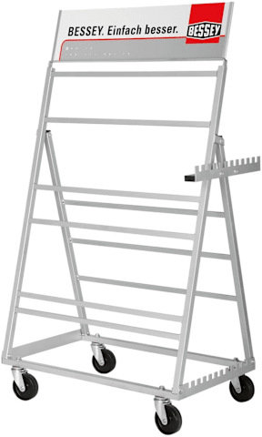 Sehr stabile Metallkonstruktion auf Rollen Maße 100 x 60 x 153 cm Hält bis zu 120 Zwingen, sogar lange Schraubknechte Temperguss- und Ganzstahlzwingen mit Spannweiten zwischen 200 und 2000 mm Mit Schild und Schildhalter Als Verkaufshilfe und für den Werkstattbereich geeignet