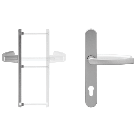 Die blaugelb Drückergarnitur ½ DGT30 innen PZ92 mit einer Schildbreite von 30 mm (Entfernung PZ92) ist für Holz-, Kunststoff- und Metallaußentüren geeignet. Sie ist mit einer Hochhaltefederung zur exa