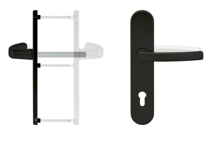 Die blaugelb Drückergarnitur ½ DGT50 innen PZ92 mit einer Schildbreite von 50 mm (Entfernung PZ92) ist für Holz-, Kunststoff- und Metallaußentüren geeignet. Sie ist mit einer Hochhaltefederung zu
