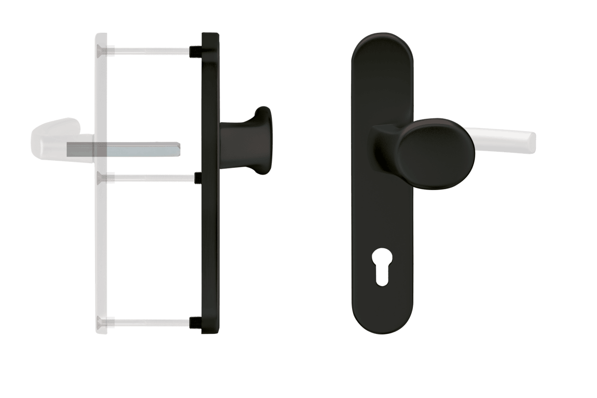 Die blaugelb Wechselgarnitur ½ KGT50 außen PZ92 Black Line mit einer Schildbreite von 50 mm (Entfernung PZ92) ist für Holz-, Kunststoff- und Metallaußentüren geeignet. Die Garnitur kann mit einer blau