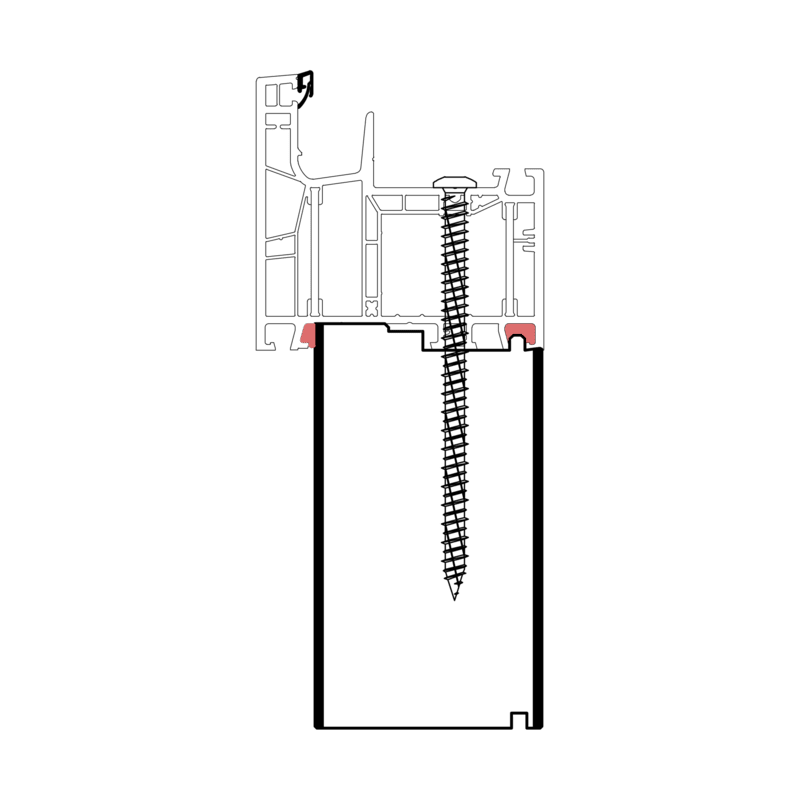 Die konturangepasste Aufnahme gewährleistet eine schnelle und einfache Montage des Profils mit der blaugelb Rahmenfixschraube FK-T30 und eine exakte Positionierung durch die Konturfräsung. Somit entsteht keine Hohlkammer zwischen Bankanschlussprofil und Blendrahmen und durch die prozesssichere Abdichtung wird Luftdichtheit erreicht.