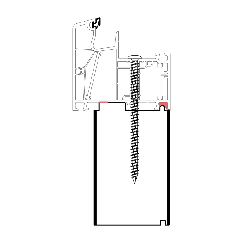 Die konturangepasste Aufnahme gewährleistet eine schnelle und einfache Montage des Profils mit der blaugelb Rahmenfixschraube FK-T30 und eine exakte Positionierung durch die Konturfräsung. Somit entsteht keine Hohlkammer zwischen Bankanschlussprofil und Blendrahmen und durch die prozesssichere Abdichtung wird Luftdichtheit erreicht.