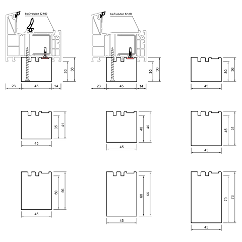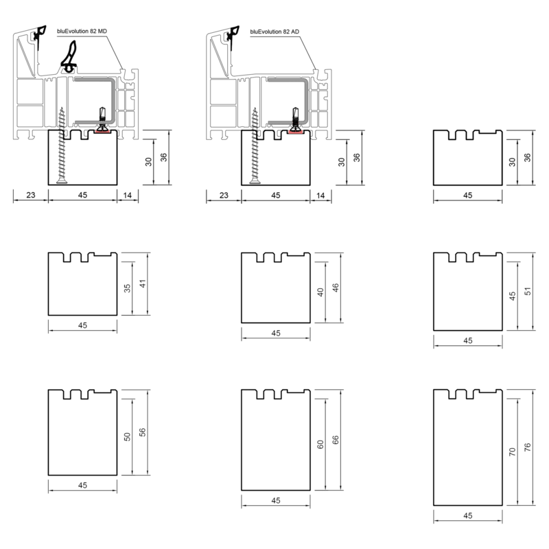 Die profilbezogenen Bankanschlussprofile für Kunststoff-, Holz- oder Aluminiumfenster sind in diversen, unterschiedlichen Formen und Höhen erhältlich.