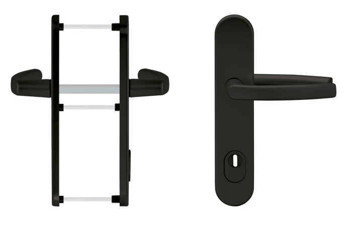 Die blaugelb Drückergarnitur DGT50 PZ92 ZA ES1 mit einer Schildbreite