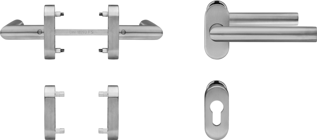 Die blaugelb Rahmentürdrückergarnitur 90°-Form FS auf ovaler Rosette ist für Feuer-, Rauch- und Fluchtwegtüren mit erhöhtem Sicherheitsanspruch in puncto Feuerschutz nach DIN 18273 geeignet und dement