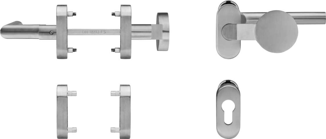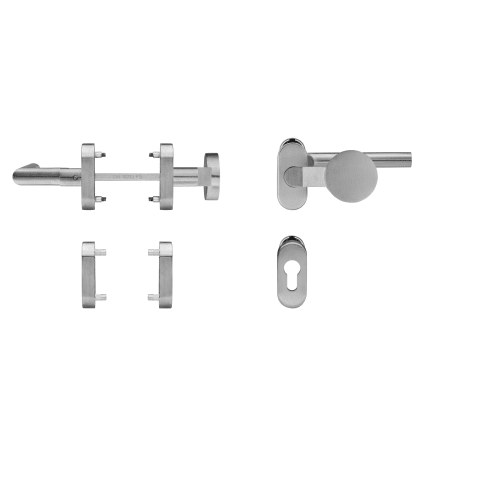 Die formschöne, elegante Garnitur aus hochwertigem Edelstahl wird mittels verdeckter Verschraubung befestigt. Die mitgelieferte Befestigungslösung besteht aus Blindnietmuttern und den dazu passenden metrischen Schrauben, die einen sicheren Sitz am Türflügel gewährleisten.