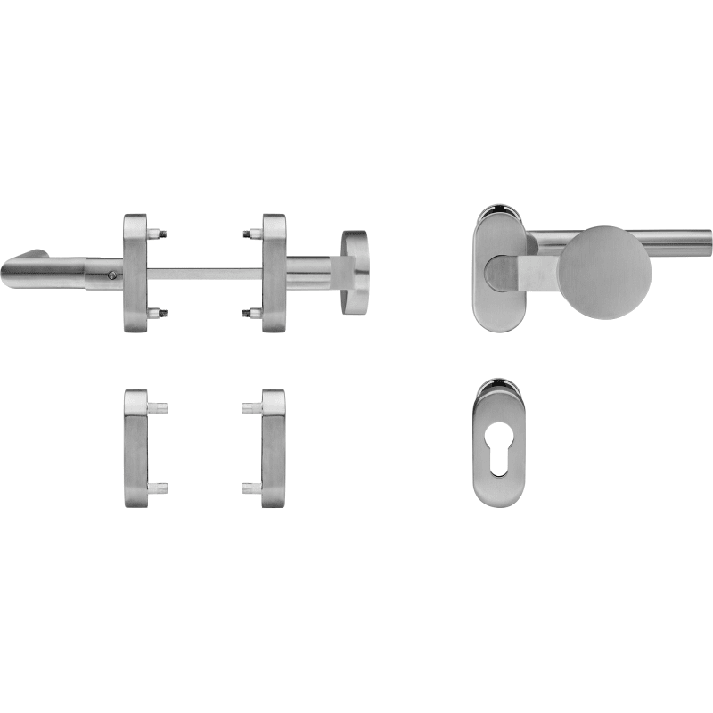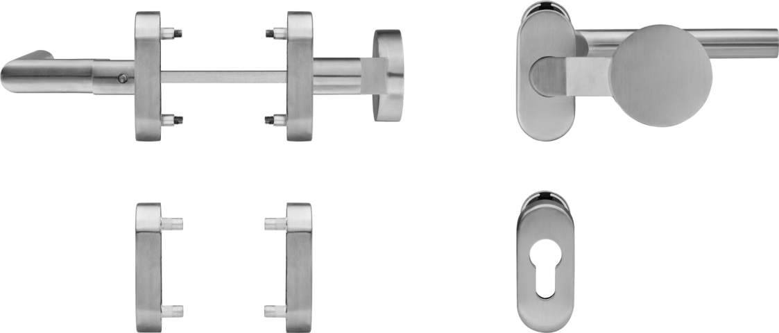 Die formschöne, elegante Garnitur aus hochwertigem Edelstahl wird mittels verdeckter Verschraubung befestigt. Die mitgelieferte Befestigungslösung für Aluminiumtüren besteht aus Blindnietmuttern und den dazu passenden metrischen Schrauben, die einen sicheren Sitz am Türflügel gewährleisten.  Für die Befestigung an Kunststofftüren muss auf eine eigene Befestigungslösung zurückgegriffen werden.