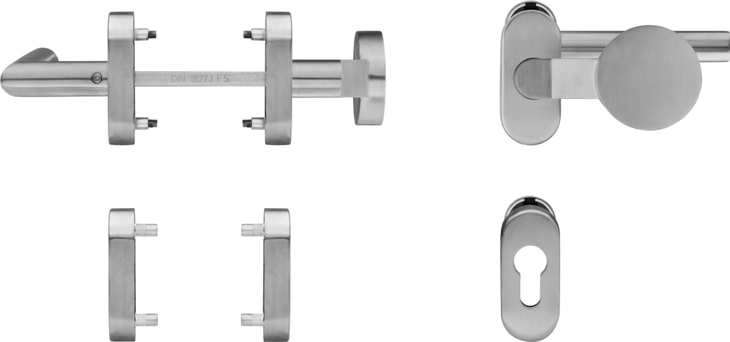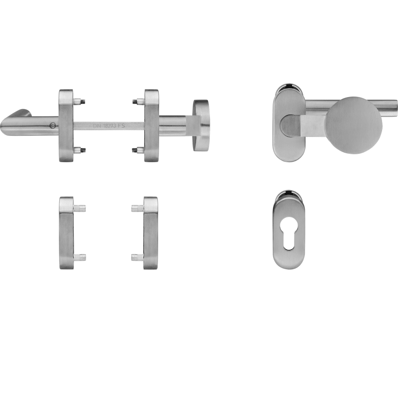 Die formschöne, elegante Garnitur aus hochwertigem Edelstahl wird mittels verdeckter Verschraubung befestigt. Die mitgelieferte Befestigungslösung besteht aus Blindnietmuttern und den dazu passenden metrischen Schrauben, die einen sicheren Sitz am Türflügel gewährleisten.