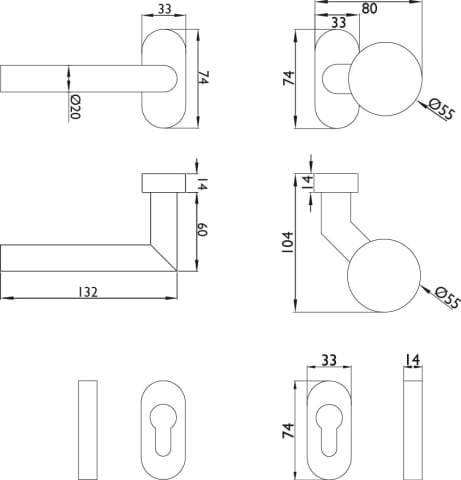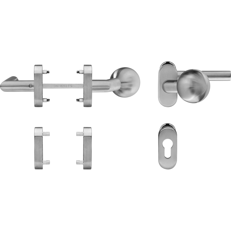 Die blaugelb Rahmentürwechselgarnitur 90°-Form/Knopf gekröpft FS auf ovaler Rosette ist für Feuer-, Rauch- und Fluchtwegtüren mit erhöhtem Sicherheitsanspruch in puncto Feuerschutz nach DIN 18273 geei