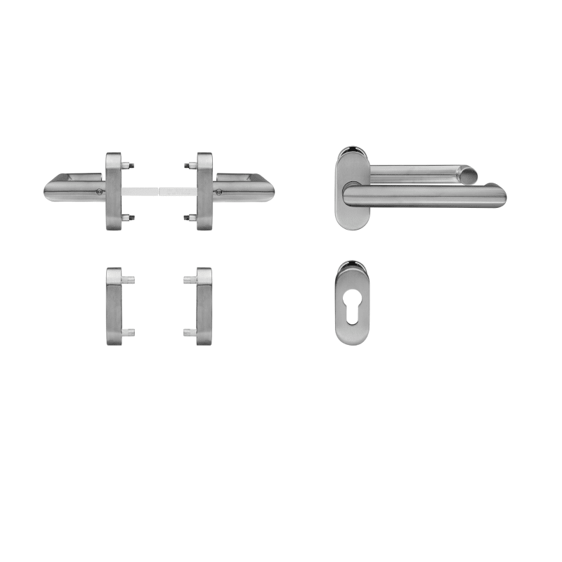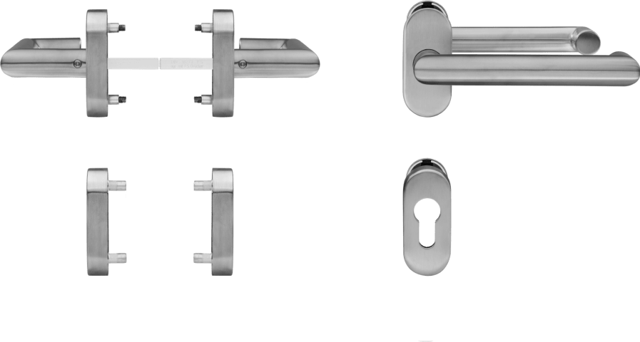 Die blaugelb Rahmentürdrückergarnitur U-90°-Form AP auf ovaler Rosette ist für Fluchtwegtüren nach DIN EN 179 (Notausgangstüren) sowie für Feuer- und Rauchtüren mit erhöhtem Sicherheitsanspruch nach D
