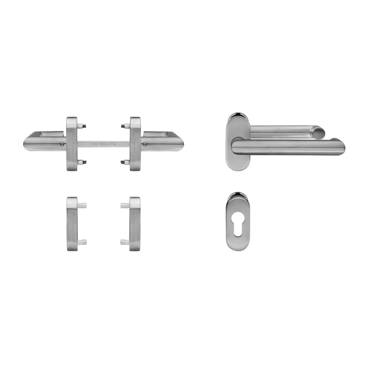 Die formschöne, elegante Garnitur aus hochwertigem Edelstahl wird mittels verdeckter Verschraubung befestigt. Die mitgelieferte Befestigungslösung besteht aus Blindnietmuttern und den dazu passenden metrischen Schrauben, die einen sicheren Sitz am Türflügel gewährleisten.