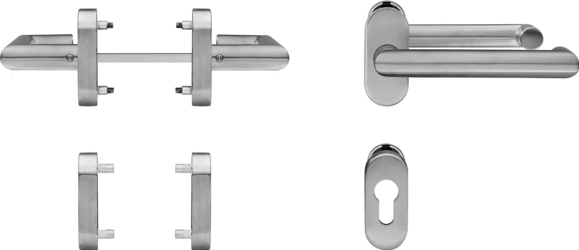 Die formschöne, elegante Garnitur aus hochwertigem Edelstahl wird mittels verdeckter Verschraubung befestigt. Die mitgelieferte Befestigungslösung für Aluminiumtüren besteht aus Blindnietmuttern und den dazu passenden metrischen Schrauben, die einen sicheren Sitz am Türflügel gewährleisten. Für die Befestigung an Kunststofftüren muss auf eine eigene Befestigungslösung zurückgegriffen werden.