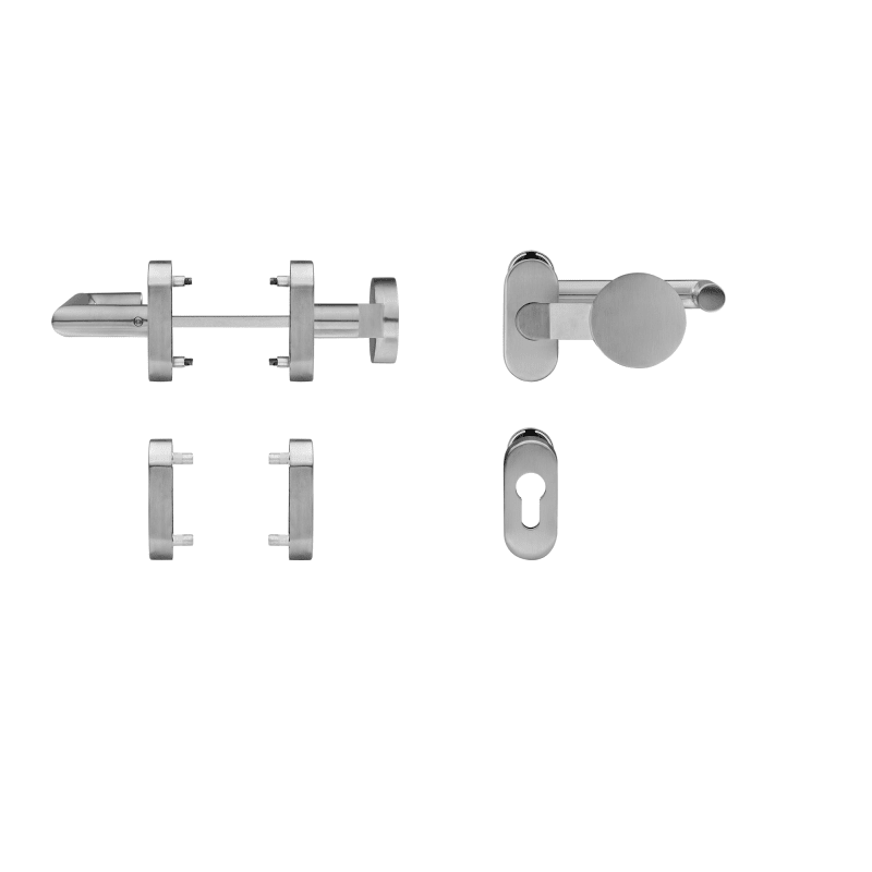 Die blaugelb Rahmentürwechselgarnitur U-90°-Form/Knopf flach gekröpft Kl. 4 auf ovaler Rosette ist für Aluminiumtüren (mitgelieferte Befestigung) oder auch Kunststofftüren im Objektbereich nach DIN EN