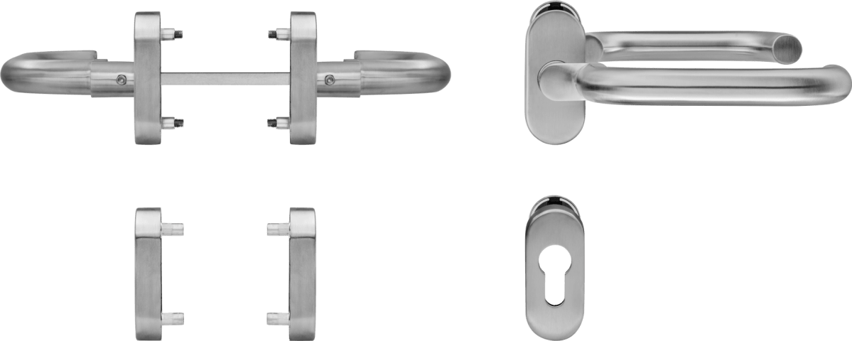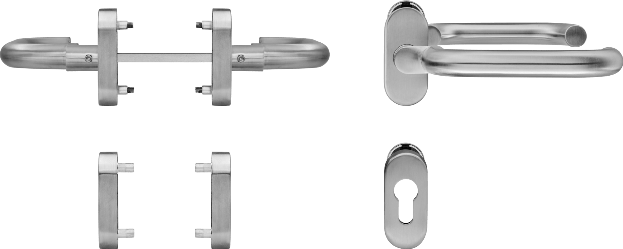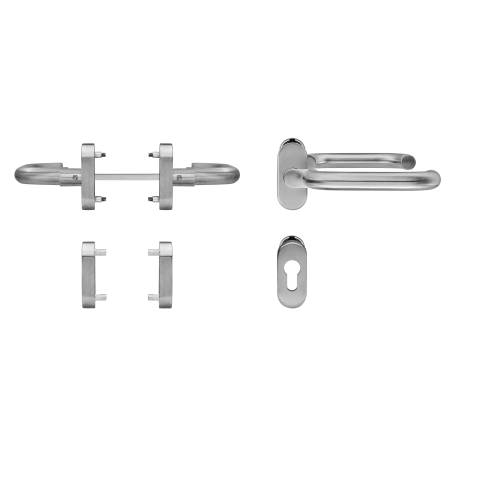 Die blaugelb Rahmentürdrückergarnitur U-Form gekröpft Kl. 4 auf ovaler Rosette ist für Aluminiumtüren (mitgelieferte Befestigung) oder auch Kunststofftüren im Objektbereich nach DIN EN 1906:2012 geeig