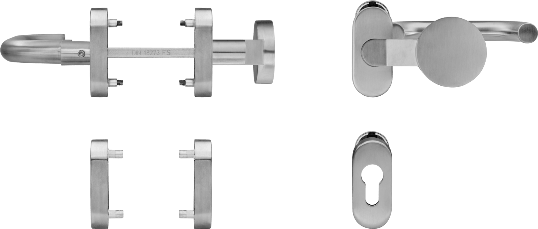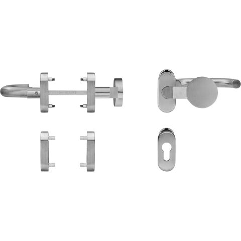 Die blaugelb Rahmentürwechselgarnitur U-Form/Knopf flach, beidseitig gekröpft FS & AP auf ovaler Rosette ist für Fluchtwegtüren nach DIN EN 179 (Notausgangstüren) sowie für Feuer- und Rauchtüren m