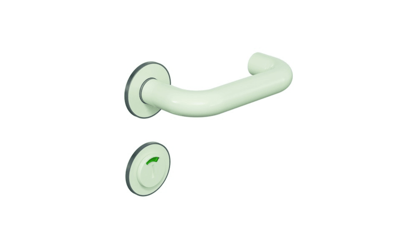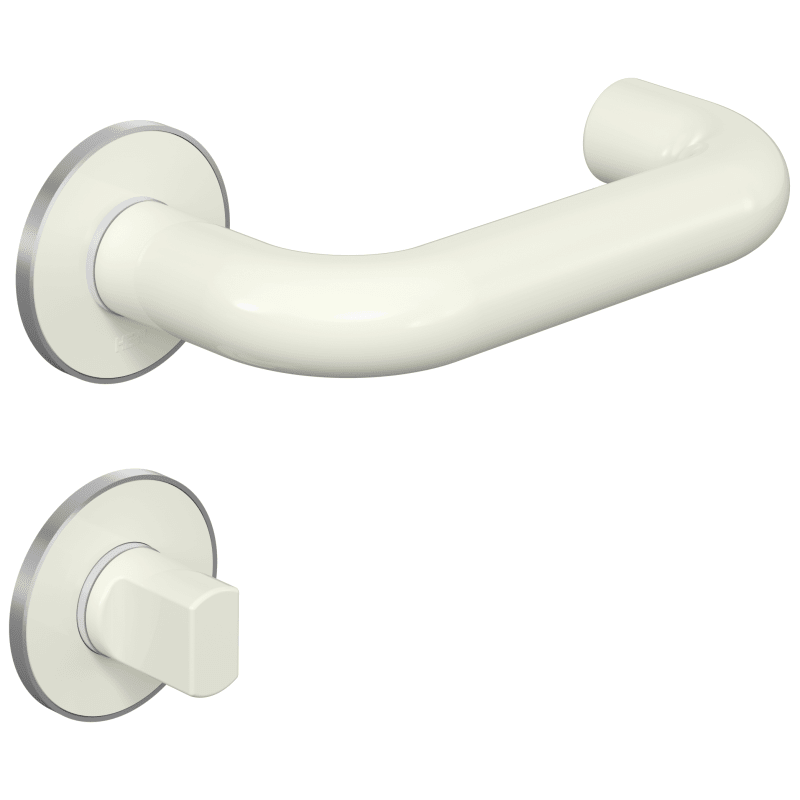Frei-Besetzt-Garnitur mit flachen Rosetten nach DIN 18255 und DIN EN 1906 und Inlay aus farbigem Polyamid, bestehend aus: Türdrücker Modell 111.23PC in U-Form aus Polyamid hochglänzend, mit durchgehe