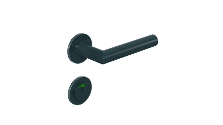 Frei-Besetzt-Garnitur mit flachen Rosetten nach DIN 18255 und DIN EN 1906 und Inlay aus farbigem Polyamid, bestehend aus: Türdrücker Modell 162.21PC in Gehrungsform aus Polyamid hochglänzend, mit dur