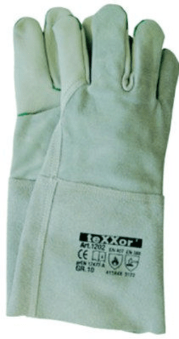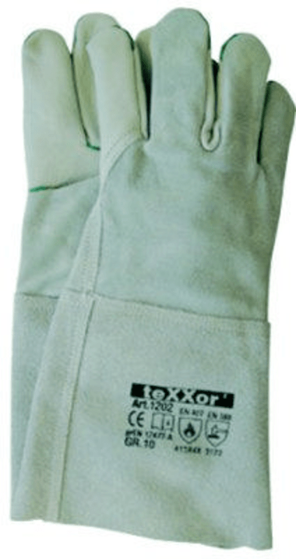 Schweißerhandschuhe Nr. 1202 Rindvoll-/Spaltleder, natur, gemäß prEN 12477-A, ca. 35 cm lang.