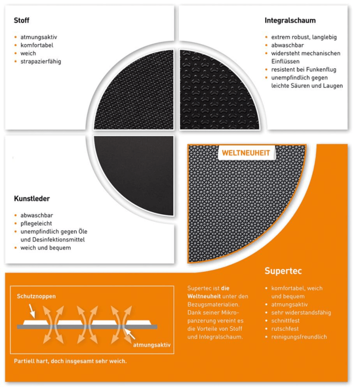 • Integralschaum: robust, atmungsaktiv, beständig gegen leichte Säuren und Laugen, leicht abwaschbar, problemlos zu reinigen