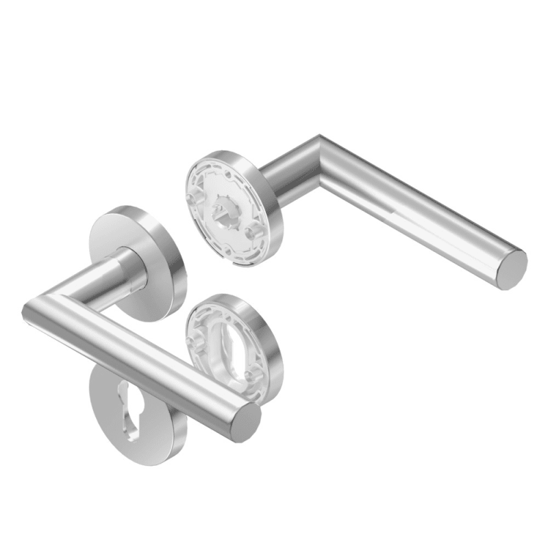 BKS Drückergarnitur BELCANTO B-70000; Abdeckung: mit Rosetten; Form: rund; Vierkant: 8 mm; Material: Edelstahl; Befestigungsart: verdeckt verschraubt; Befestigungstechnik: mit Stütznocken; Benutzerkla