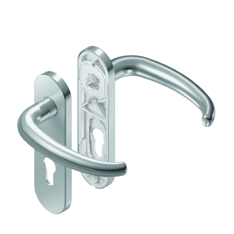 BKS Drückergarnitur TREMOLO B-70010; Abdeckung: Kurzschild; Form: oval; Vierkant: 8 mm; Material: Edelstahl; Befestigungstechnik: mit Stütznocken; Befestigungsart: verdeckt verschraubt; Benutzerklasse: Klasse 4; Basis: Drückergarnitur; Ausführung: mit Drücker H6.0; Lochung: Profilzylinder gelocht; Entfernung: 72 mm; Farbton: edelstahl; Oberfläche: matt gebürstet; DIN-Richtung: DIN Links-Rechts; Lagerung: festdrehbar,wartungsfrei; Befestigungssystem: Stiftverbindung; Drückerbefestigung: Vierkantstift; Drückerform: gebogen; Anschlagrichtung: Drücker rechts/links verwendbar; Türstärke min.: 37 mm; Türstärke max.: 42 mm; Länge: 167 mm; Breite: 45 mm; Schildstärke: 9 mm; Drückerdurchmesser: 21 mm; Drückerhöhe: 70 mm; Drückerlänge: 145 mm; Norm: DIN EN 1906; Einsatzbereich: Objekttür; Türart: Abschlusstüren; Türwerkstoff: Holz,Stahl